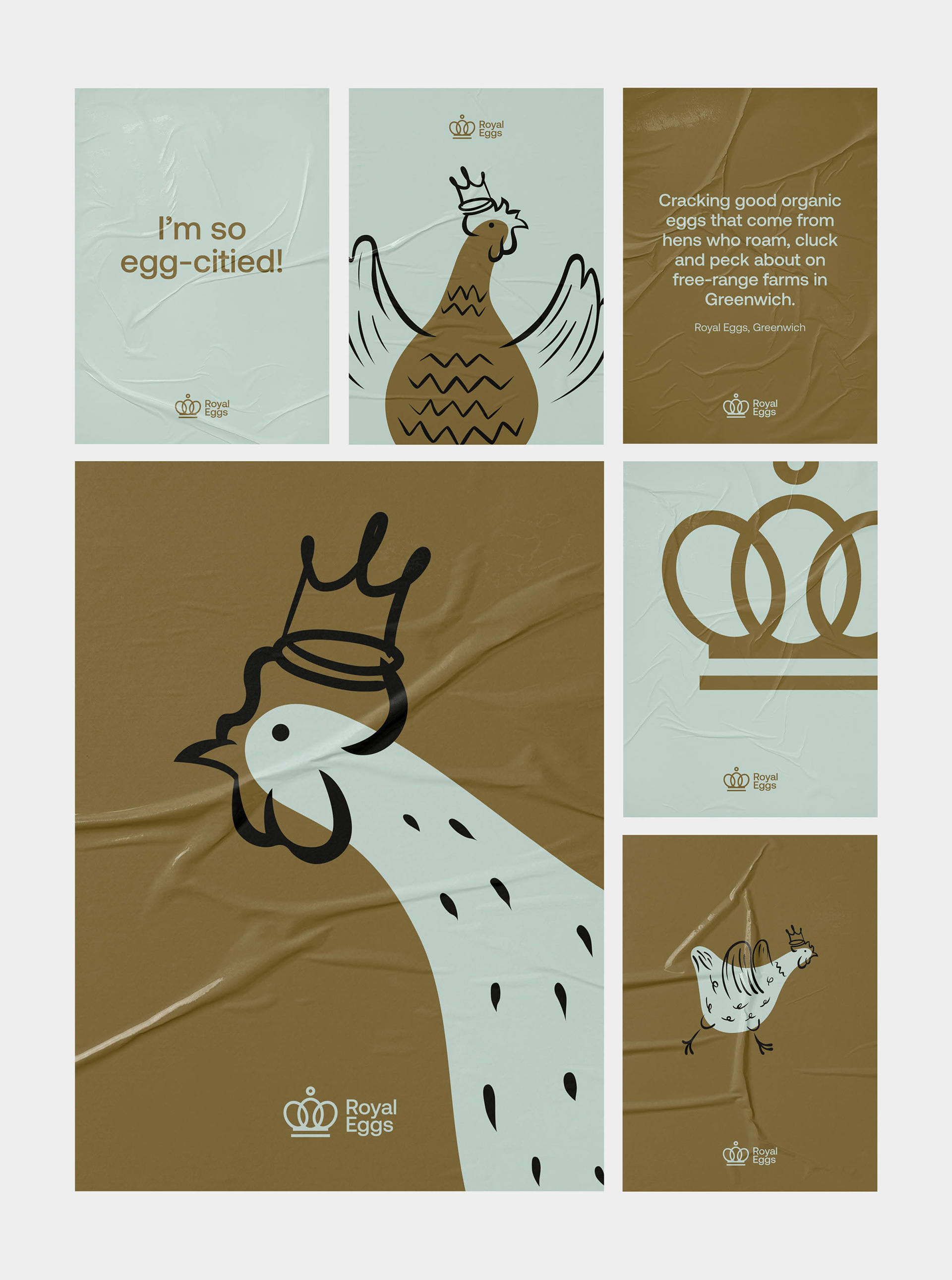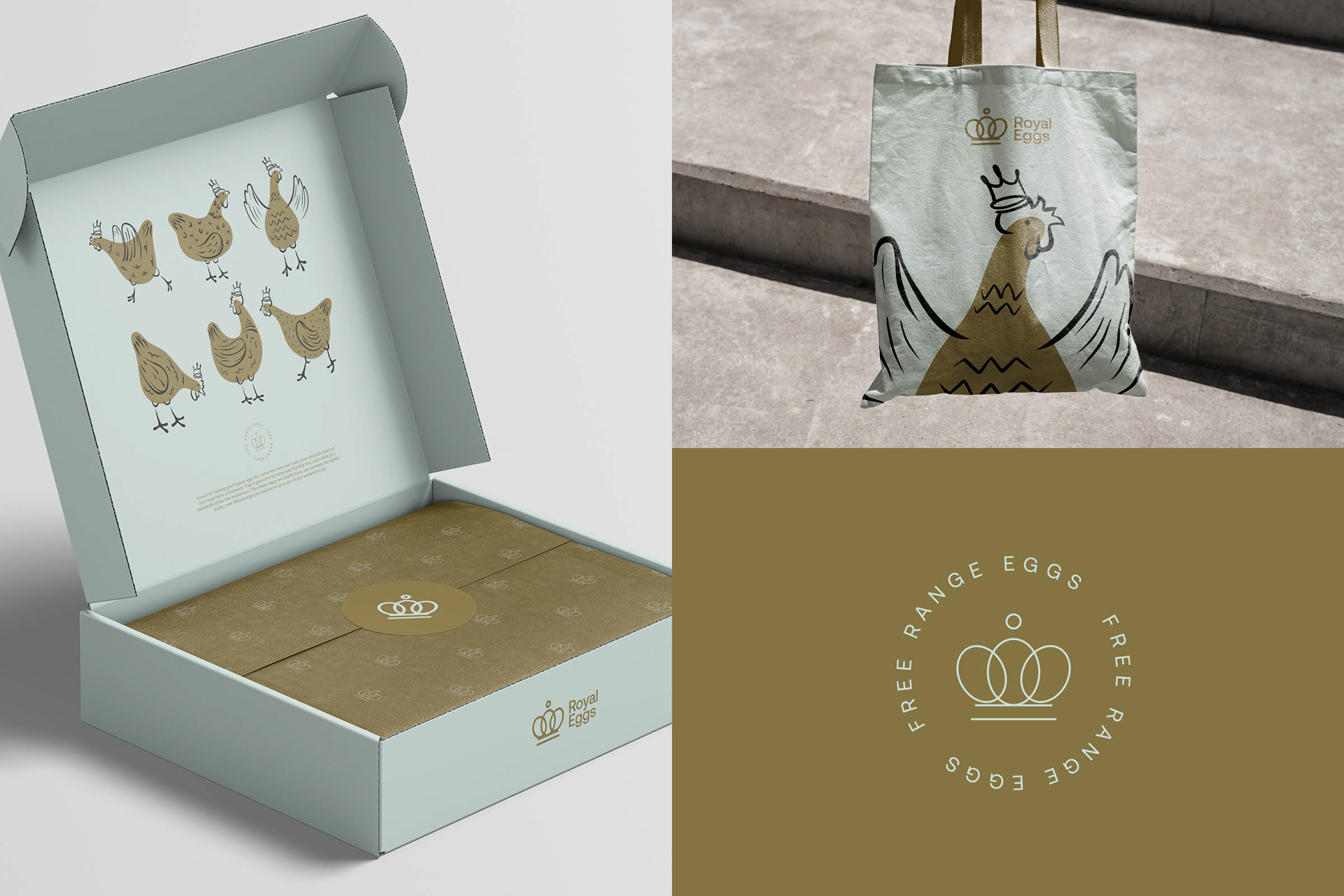 Royal Eggs is a small organic egg production farm located in the Royal borough of Greenwich. The logomark design is a combination of three eggs and a crown, creating a unique mark that represents the location and heritage of the farm.